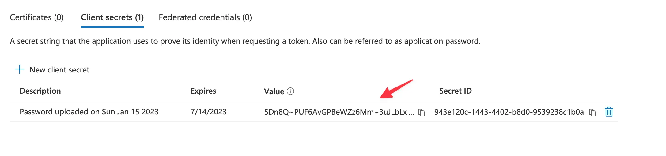 Copy and store your client secret value. Make sure to copy the value immediately, as you’re not gonna be able to see it again after navigating.